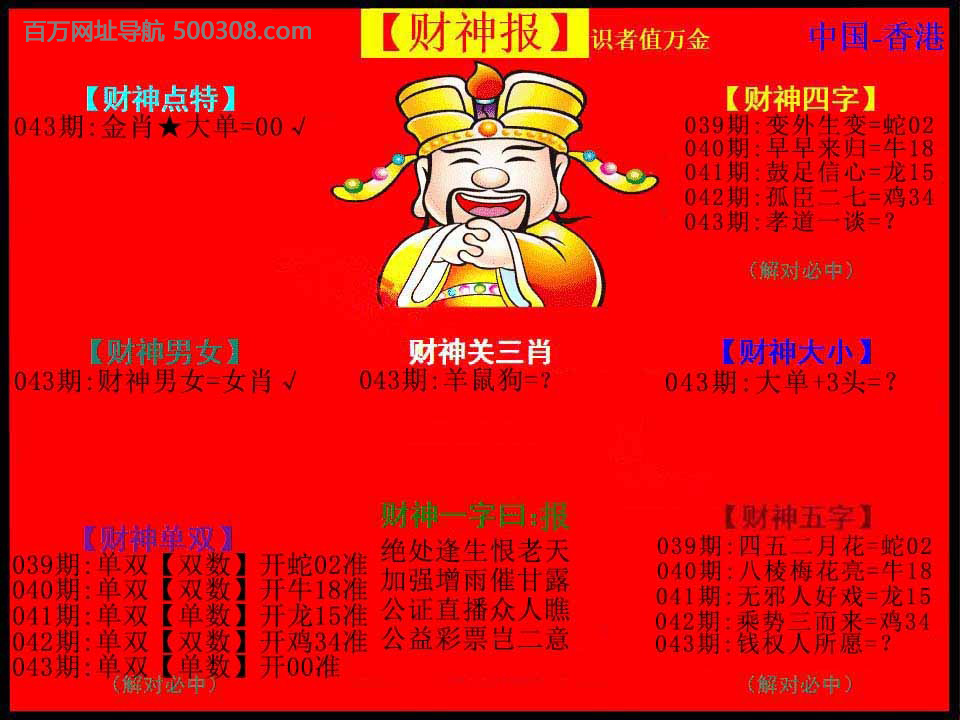 043期彩霸王诗:猴前龙后前世定,三问子中有老虎。